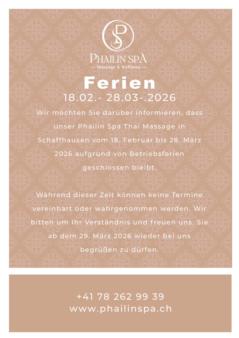 Willkommen im Phailin Spa – Ihre Oase der Entspannung mitten in Schaffhausen. Unser Spa vereint traditionelle thailändische Heilkunst mit moderner Wellness-Expertise. Seit unserer Gründung haben wir uns darauf spezialisiert, Ihnen authentische Thai-Massagen und exklusive Spa-Behandlungen anzubieten, die Körper und Geist in perfekte Harmonie bringen.
